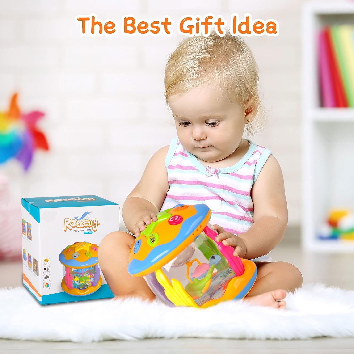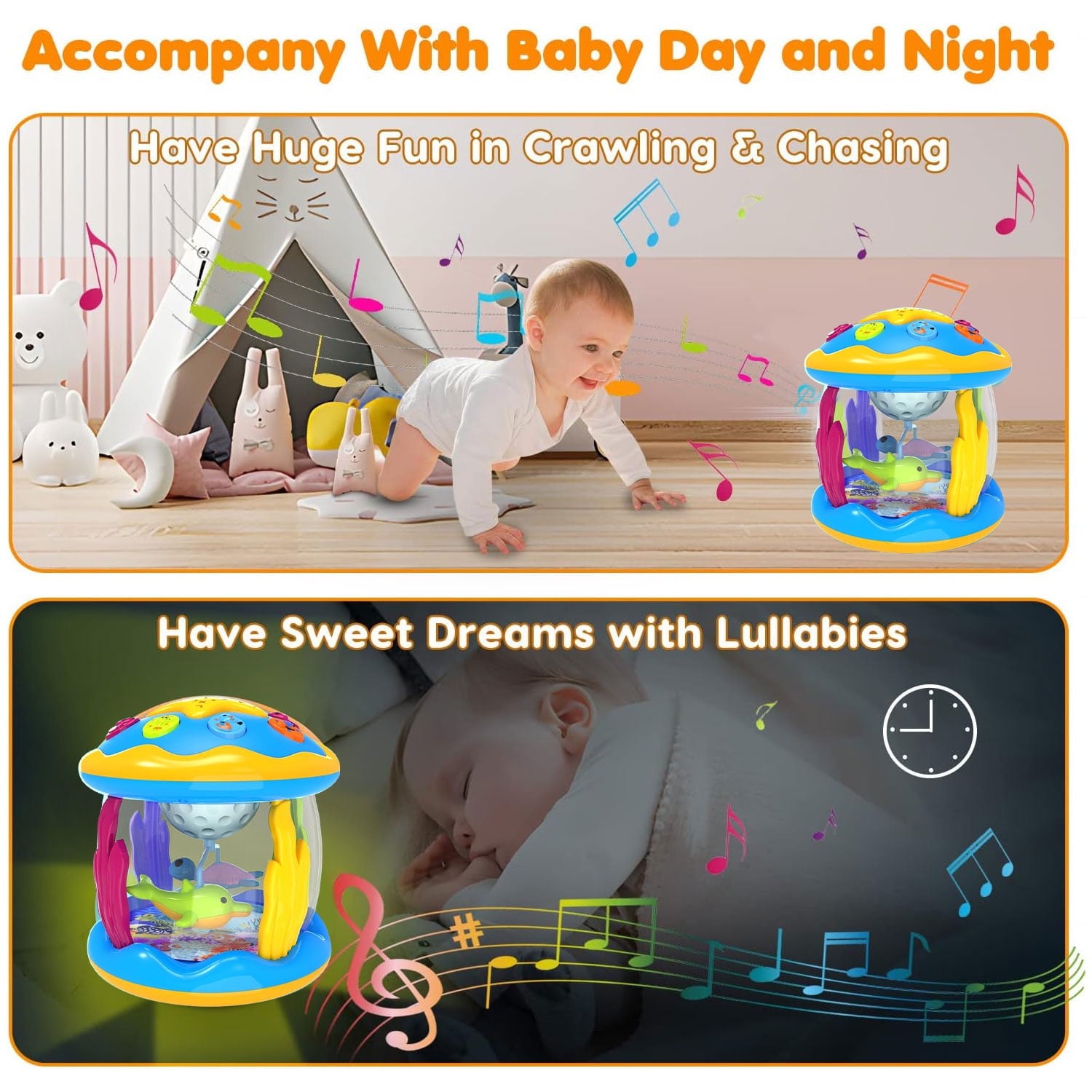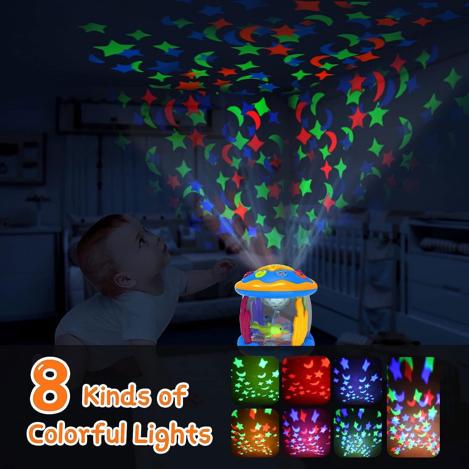 • 🐬Rotating Light Up Baby Toys: This baby toy features 360° rotating dolphins and turtles, equipped with 8 different lights to create a perfect underwater world atmosphere, sparking the baby's unlimited imagination. The glowing toy projects light onto the ground, providing a gentle light while protecting the baby's eyes from harm, dispersing the dark and creating a warm and dreamy night.
