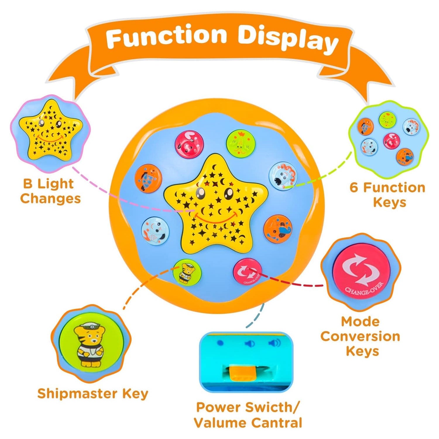 Different kinds of wonderful colors can create the atmosphere of a marine museum even at home, it can let baby learn more real ocean knowledge. This baby learning, walking, crawing & tummy time toys suitable for babies from 6-12 months and 1-2-year-old boys and girls. This BEEPRINCESS baby musical toy makes 7 animal sounds and 6 kinds of melody music, it can help to develop the brains of babies. Baby can freely tap star-shaped button on the top of the toy to switch between different drum sounds, let baby feels like a drummer, also exercise the baby's physical coordination. BEEPRINCESS versatile baby toy is a great gift to babies and toddlers for birthdays, Christmas, Easter and other holidays. Fit for all 6+ month children, which is a high quality comprehensive multi-function kids toys, combines the functions of projection, music, rotation, animal and ocean themes, it helps the development of inspiring intelligence.
